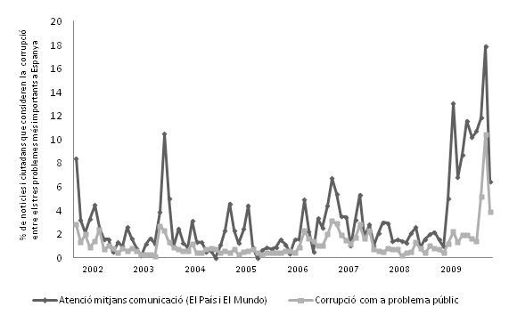 L’anàlisi de les dades del baròmetre del CIS i de les portades de El País i El Mundo (Palau i Davesa 2013), posa de manifest que quan augmenta la cobertura mediàtica dels escàndols de corrupció, augmenta també el nombre de ciutadans que consideren que la corrupció es troba entre els principals problemes d’Espanya (gràfic 1). L’impacte dels mitjans és elevat quan apareixen escàndols de corrupció nous, i quan aquests reben una cobertura mediàtica intensa. Les notícies que més influencien l’opinió pública són les publicades durant les quatre setmanes anteriors a la realització dels sondejos.