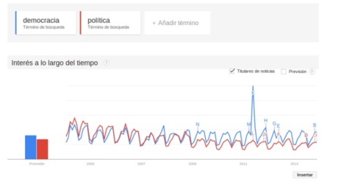 Tendències de recerca de la paraula “democràcia” (en blau) i la paraula “Política” a google des de 2003 fins a 2013 Font: Google Trends