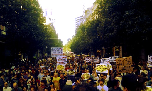 El 15M reemergeix el 15 d’octubre del 2011 i es globalitza el conflicte, es connecta amb els Estats Units, amb Occupy Wall Street, en part catalitzat per espanyols residents a Nova York que, remoguts pel que estava passant aquí, inicien el que després acabarà amb un moviment que s’estendrà i es multiplicarà per tot el país. Amb les eleccions del 20N es donava de nou per enterrat i torna la primavera al 2012, primer la Valenciana i després l’aniversari del 15M, noves mobilitzacions multitudinàries, i afinant molt més en les demandes i hibridant-se amb aquestes a través de la sanitat o l’educació, donant lloc mesos després a la “marea blanca” per a la defensa de la sanitat pública i universal i la “marea verda” (groga a Catalunya) per l’educació, davant de l’onada creixent de retallades en els serveis públics. Veiem sorgir noves identitats col·lectives molt fortes i amb el mateix estil novell i en xarxa com els Iaio flautes, 15MpaRato, o la Plataforma d’Afectats per la Hipoteca (PAH), que tot i néixer al 2008, es recombina des d’un primer moment amb el propi 15M en una relació indissociable simbiòtica, esdevenint en determinats moments la seva màxima expressió pública.