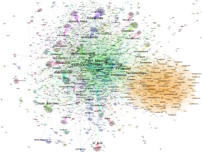 Visualització feta a partir de les interaccions a Twitter a partir dels hashtags vinculats amb La PAH durant el mes de febrer de 2013. Autor: Alberto Lumbreras