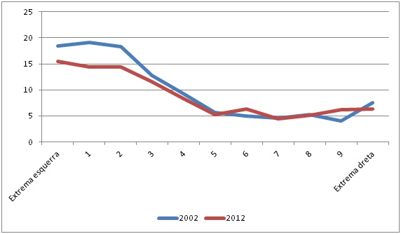 Gràfic 4: Participació en manifestacions segons posició en l’eix ideològic (2002-2012)