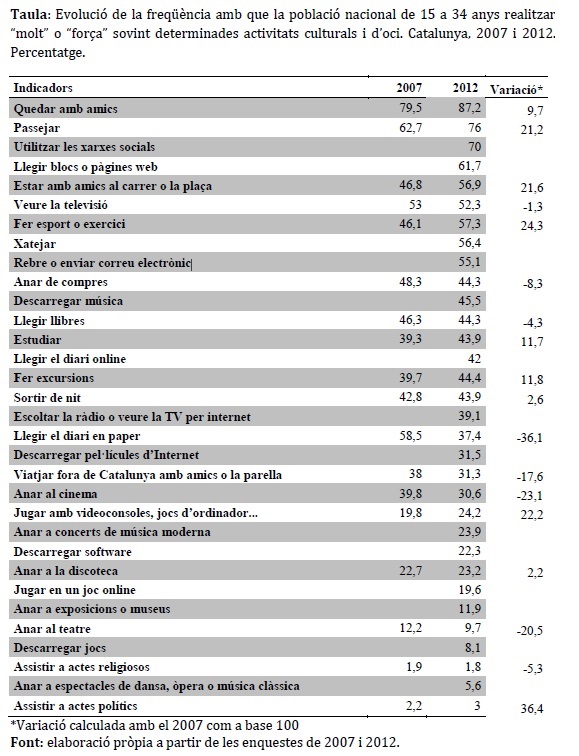 Entre el 2007 i el 2012 la variació (positiva o negativa) de la participació en les activitats d’oci pot emmarcar-se en els dos esdeveniments abans esmentats de la crisi i de la innovació tecnològica. Primerament, ens trobem que aquelles activitats menys oneroses econòmicament són aquelles que no només continuen essent les més practicades el 2012 sinó que entre els dos anys de comparació han augmentat la seva pràctica. Quines són aquestes activitats? Doncs quedar amb els amics i amigues i passejar. En segon lloc apareixen amb força activitats de lleure molt relacionades amb l’entorn digital i que l’any 2007 eren força menys practicades o no es contemplaven en l’enquesta de joventut de 2007. Algunes d’aquestes activitats serien jugar amb jocs d’ordinador, de videoconsoles o llegir diaris online, per posar dos exemples. En tercer lloc veiem una clara reducció en la pràctica d’aquelles activitats que suposen incórrer en un cost addicional per realitzar-les; els exemples principals són anar de compres, llegir el diari en paper, viatjar fora de Catalunya amb la parella o amics, anar al teatre i anar al cinema.