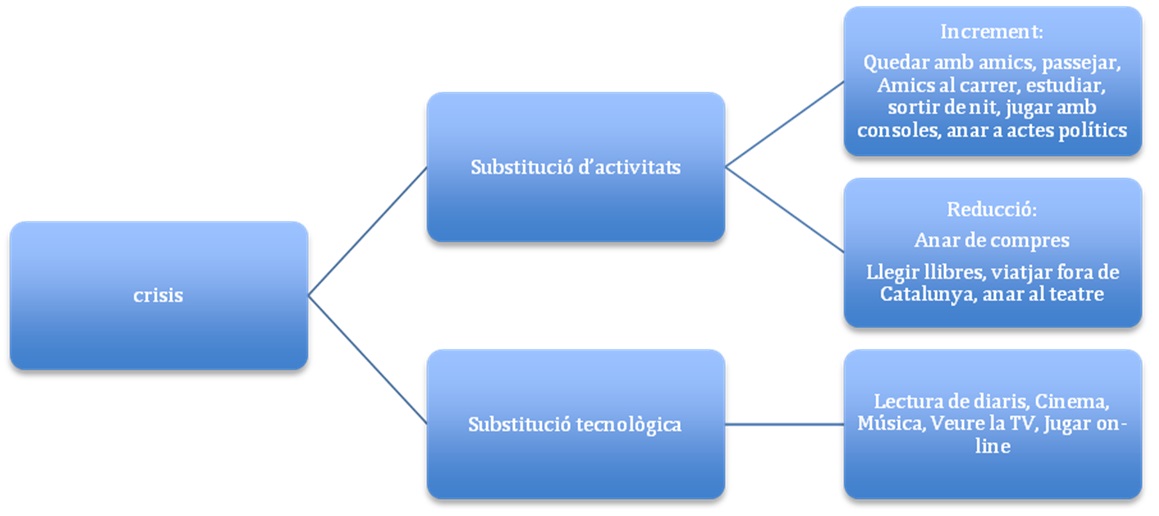 Entre els anys 2007 i 2012, enmig d’un context de forta crisi, la societat catalana s’ha vist immersa en diferents processos socials que tenen una influència elevada en les activitats que fan els joves. Ens centrarem en dos dels principals esdeveniments de canvi: per una banda ens trobem amb una transformació tecnològica de les activitats de lleure i per l’altra amb la crisi econòmica del 2008. El canvi tecnològic influeix en la manera de fer les activitats de lleure tradicionals que són substituïdes parcialment per les seves variants tecnològiques. La crisi, en canvi, accentua l’efecte substitució de la tecnologia i afecta amb més intensitat a les activitats de lleure.