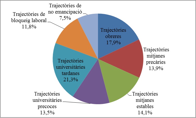 a) Trajectòries obreres (17,9%). Aquesta trajectòria es caracteritza per un abandonament prematur dels estudis seguit per una incorporació ràpida al mercat de treball i, sovint, per una emancipació també primerenca. L’activitat laboral dels joves que han seguit aquesta trajectòries ha estat, doncs, llarga, però marcada per la inestabilitat i l’ocupació en categories mitjanes o la mobilitat descendent. Una part important d’aquests joves sempre o sovint tenen dificultats per arribar a final de mes. La proporció dels qui viuen en parella és baixa i són el segon grup amb més joves a la llar d’origen.