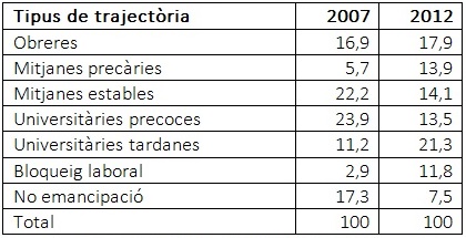 La coincidència en les principals característiques de cada tipus de trajectòria és remarcable i suggereix que la crisi no ha provocat tant l’emergència de nous tipus de trajectòria (més enllà de l’emigració, que lògicament no ha aparegut a l’EJC) com la redistribució de les persones joves entre els tipus ja existents. En general, s’aprecia que les trajectòries vinculades a processos de vulnerabilitat (obreres, mitjanes precàries i bloqueig laboral) han passat del 25,5% el 2007 al 43,6% el 2012. Inversament, les trajectòries ràpides i relativament privilegiades (mitjanes estables i universitàries) han passat del 67,3% el 2007 al 48,9% el 2012.