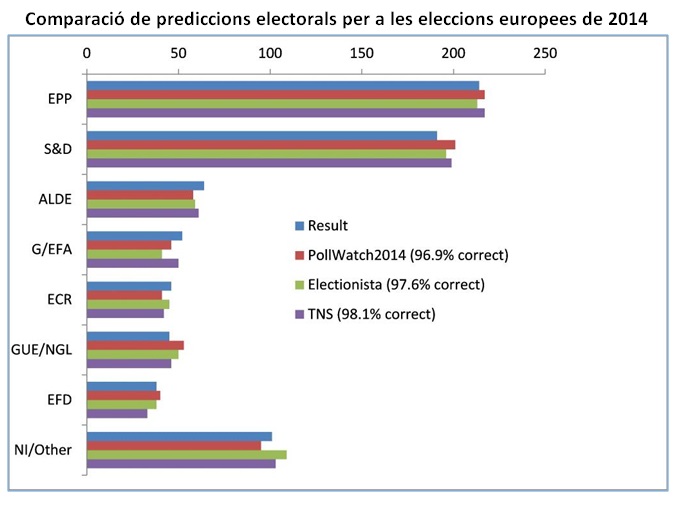 Totes tres iniciatives, amb variacions lleugeres d’escons entre grups polítics europeus i partits nacionals, van donar la victòria al Partit Popular Europeu (PPE), i van sobredimensionar el resultat dels Socialistes i Demòcrates (S&D), que encapçalaven les enquestes fins a finals de març de 2014. Un altre tret comú correctament predit fou el sorgiment de nous partits i l’eixamplament dels extrems, tant a l’esquerra com a la dreta de l’hemicicle.