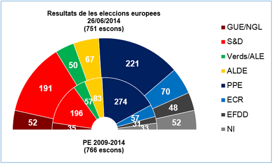 Les eleccions al Parlament Europeu de 2014 van donar la victòria al PPE, però també han canviat considerablement l’equilibri de poder de l’eurocambra. El grup S&D van tenir uns resultats pitjors del previst. Els liberals (ALDE) van quedar en tercer lloc, encara que amb un 25% menys d’escons. Els verds (Verds/ALE) es disputen la quarta posició amb els conservadors (ECR). L’esquerra radical (GUE-NGL) manté el sisè lloc i els euroescèptics (EFD) el darrer lloc. El nombre d’eurodiputats no-inscrits (NI) es va triplicar, i a l’hora de tancar aquest article, la gran pregunta era si els partits d’extrema dreta aconseguirien formar un grup parlamentari. Per formar-ne un de nou, calen 25 eurodiputats de 7 països diferents.