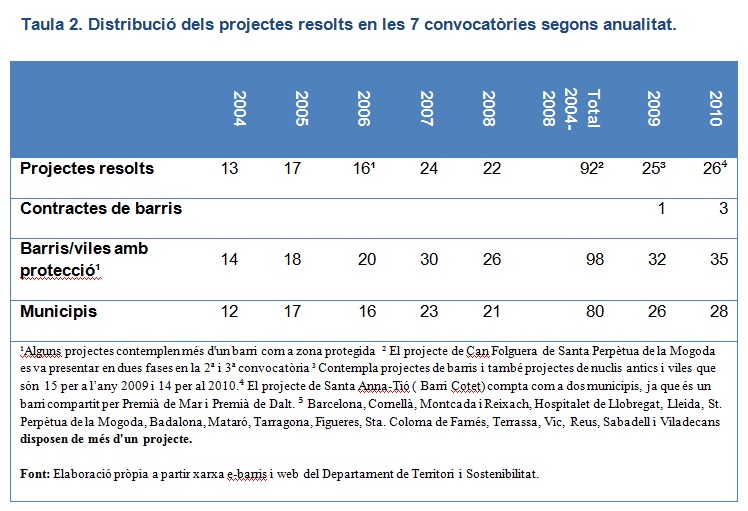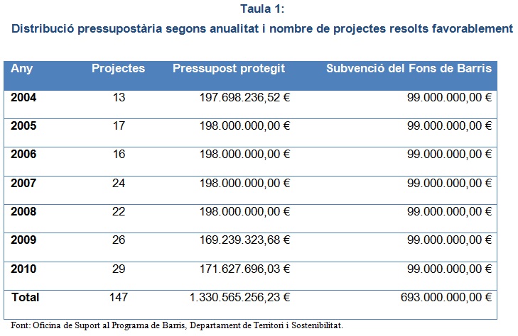 Malgrat la situació descrita, la Llei de Barris a Catalunya ha aportat elements interessants que cal posar de relleu: Ha resolt i ha suposat set convocatòries d’ajuts, s’han aprovat, impulsat i financiat 143 projectes d’intervenció i 4 propostes de continuïtat, dels quals 31 han finalitzat. S’han destinat prop de 1.330 milions d’euros d’inversió pública de la Generaltiat i els ajuntaments a la realització de les diferents actuacions dels projectes d’intervenció integral per tal de millorar barris o vil•les de zones protegides que es distribueixen en 117 municipis. A més, s’han creat dinàmiques i oportunitats de complementació d’altres polítiques al territori com han estat les convocatòries de Treball als Barris, encara vigents, focalitzades a desenvolupar polítiques d’inserció, formació i millora del mercat de treball local, o la convocatòria de Salut als Barris que també s’ha basat en els principis d’integralitat i subsidiarietat (Lope et al., 2009; Rodríguez & San Román, 2007).