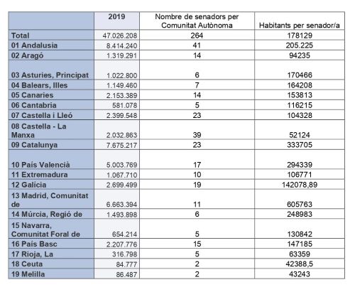 Amb aquest sistema surt un desequilibri principalment per Catalunya, així com per Madrid i la Comunitat Valenciana. Mentre a Catalunya hi ha un senador per cada 333.705 habitants, a Ceuta surt un per cada 42.388 habitants, a Castella-La Manxa cada 52.124, a Castella i Lleó 104.328 o a Euskadi 147.185. Per tant, el pes que hi té Catalunya és molt inferior al d’altres comunitats. Però encara ho és més a la Comunitat Valenciana amb 294.339 habitants per senador o a Madrid amb 605.762.